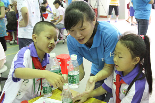 走进农民工子弟学校,放飞儿童科学梦想。5月29日,广东首场雅培家庭科学教育示范活动在广州市萝岗区永岗小学举行,省科协党组成员、副主席吴焕泉,雅培大中国区公共事务与市场支持高级总监李浩,以及省青少年科技中心、广州市和萝岗区教育局的领导和嘉宾,雅培志愿者、永岗小学师生、家长以及来自广州、东莞的观摩教师200多人参加活动。