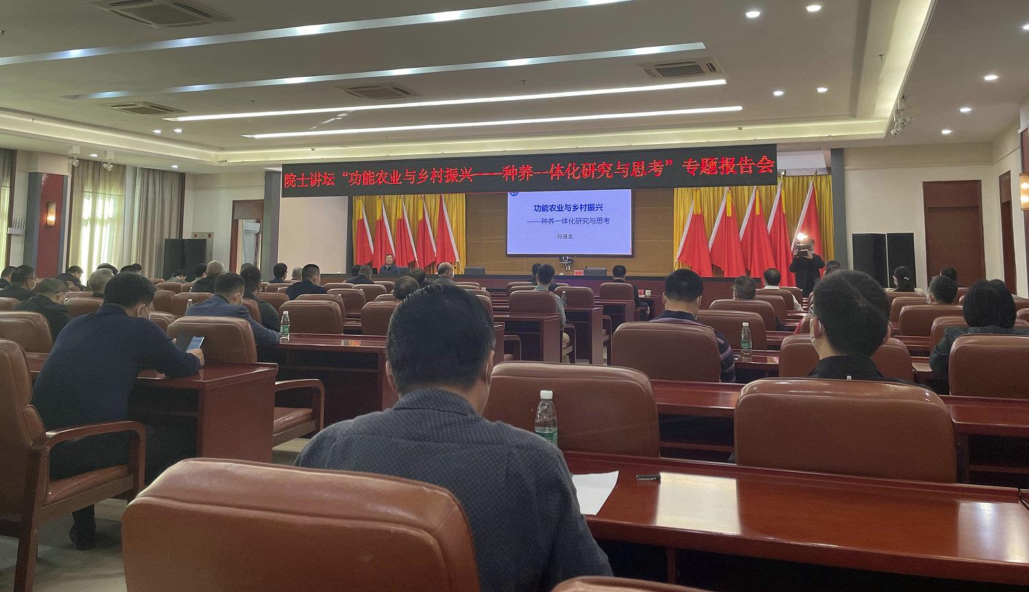 30日上午,印遇龙院士为揭西县党政干部和相关农业企业负责人作题为“功能农业与乡村振兴—种养一体化研究与思考 ”的专题报告,分别从实施乡村振兴的背景意义、研发进展、工作设想与规划、预期目标等四方面进行进行了深入浅出的讲解。为揭西县农业产业转型升级、社会经济生态效益提升、农村集体经济壮大、乡村振兴发展提供了科学指导。本次院士讲坛还以电视电话会议形式开至揭西县各乡镇(街道),听众多达700余人。