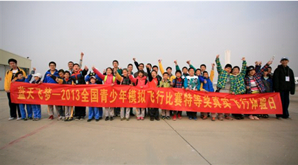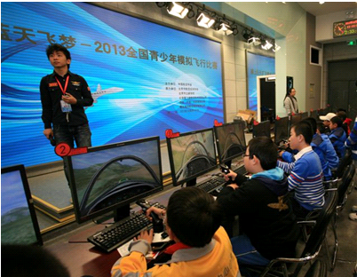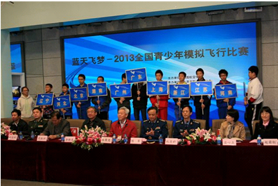 蓝天飞梦——2013全国青少年模拟飞行比赛于10月26日至27日在北京成功举行,赛事由中国航空学会主办,为全国首次举办。来自10多个省市区30多所中小学校200多名青少年参加了个人竞速飞行、个人航母起降、个人空中技巧和团体竞速接力等四大比赛。珠海市金海岸中学洪伟同学在个人竞速高中组比赛中喜获第一名,荣获王牌飞行员称号,并与17名个人项目特等奖获得者参加了乘坐通用飞机体验飞行活动。