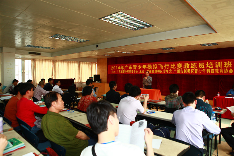 2014年广东青少年模拟飞行比赛教练员培训班于4月9日至10日在广州市越秀区少年宫成功举行。省青少年科技教育协会秘书长、省青少年科技中心主任叶新鹏;广东航空学会梅常务副理事长卫民、越秀区教育局德体卫艺科副科长罗明君、越秀区少年宫副主任叶炎富、越秀区青少年科技教育协会副会长彭玉光,以及来自全省14个地市80多名教练员、组织工作者参加活动。
