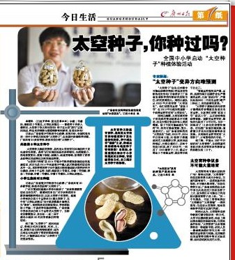 2014年4月,省青少年科技中心、省青少年科技教育协会启动了“太空种子”种植活动,受到全省各地师生的欢迎和主流媒体的关注。《广州日报》经过一周的采访调查,4月22日A13版半版全面报导该项活动,这是我省主流媒体对青少年科技教育活动的肯定和支持。该活动是2014年广东省青少年科学调查体验活动的拓展活动,也是2014年全国青少年载人航天科普系列活动之一。 详细报道请登陆:http://gzdaily.dayoo.com/html/2014-04/22/content_2604763.htm