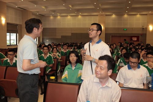 4月19日下午,2016年英才计划数学大师科普报告会在广州市执信中学隆重举行,袁亚湘院士为现场300多名师生带来一场题目为《黄金分割与优化》的精彩报告。广东省科协党组成员、副主席吴焕泉;中国科协青少年科技中心科普服务处副处长范体宇;中山大学数学与计算科学学院院长姚正安;广东省青少年科技中心主任叶新鹏;广州市执信中学校长何勇等领导嘉宾出席活动。