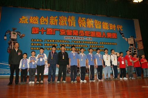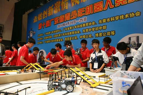 由广东省青少年科技中心、广东省青少年科技教育协会、东莞市科学技术协会主办,东莞科学馆、东莞市青少年科技教育协会、东莞中学初中部承办,广东省青少年科学基金会、西觅亚公司、博思公司等单位协办的第十届广东省青少年机器人竞赛于4月23-25日在东莞中学初中部举行。广东省科学技术协会党组成员、副主席吴焕泉、东莞市人大常委会副主任吕兢、广东省科学技术协会科普部部长黄善辉、东莞市人大教科文卫华侨外事工作委员会主任谭素红、东莞市政协常委、教科文卫体和文史委员会主任丁林枝、东莞市科学技术协会党组书记、专职副主席连希波、广东省青少年科技中心副主任叶新鹏等领导出席了开幕式。