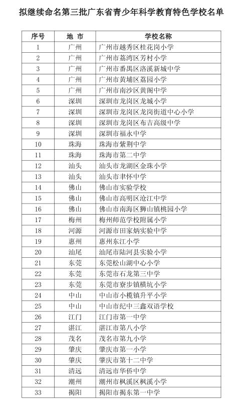 根据《广东省科学技术协会、广东省教育厅、广东省科学技术厅关于组织开展第三批广东省青少年科学教育特色学校复查工作的通知》(粤科协联〔2016〕15号)精神,2016年12月7日,省科协、省教育厅和省科技厅联合组织专家对第三批40所学校进行复查考核。现将拟继续命名的33所第三批广东省青少年科学教育特色学校在广东省青少年科技教育服务平台(www.gdkj.org.cn)上公示,名单如下。