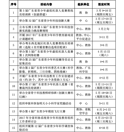 为方便地市和学校安排工作,现将2017年省青少年科技中心和省青少年科技教育协会组织开展的主要活动安排通告如下,具体时间以印发通知为准。