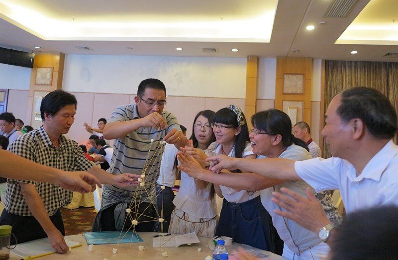 专题讲座环节,大家基本了解科技教育游戏的发展,掌握科技教育游戏设计的要点。游戏体验板块,参训人员团队完成了弹弓穿环、鲜美糖面和变废为宝等3个材料来源方便、制作成本低廉的科技教育游戏。全省首创新游戏——弹弓穿环要求只用报纸、橡皮筋和透明胶制作纸质弹弓(限重40克)和纸弹,男女两名组员在不同距离弹射穿环,看谁穿得准。弹弓穿环游戏不但考究大家的动手设计能力,而且考验弹射者的力量和眼力。鲜美糖面游戏利用适量的棉花糖和意大利面条搭建一个模型,比试高度。松软的棉花糖味道鲜美,但与细细的意大利面条“搭档”,构建一个尽可能高的模型实在不容易。变废为宝只用矿泉水瓶、纸皮等废旧材料制作一个工艺品或创意作品,考试大家的艺术创作和动手能力。2个小时里,大家既紧张又快乐,充分体验了这些融科技、艺术与体育于一体的科技游戏的神奇魅力。
